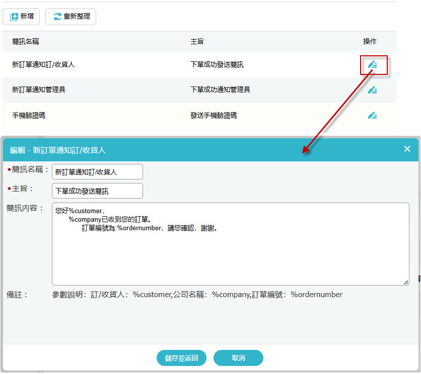 功能說明:可設定系統訂單通知、驗證碼內容並可新增簡訊範本。