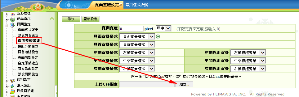 點選瀏覽,上傳CSS檔案,再點選修改即可。