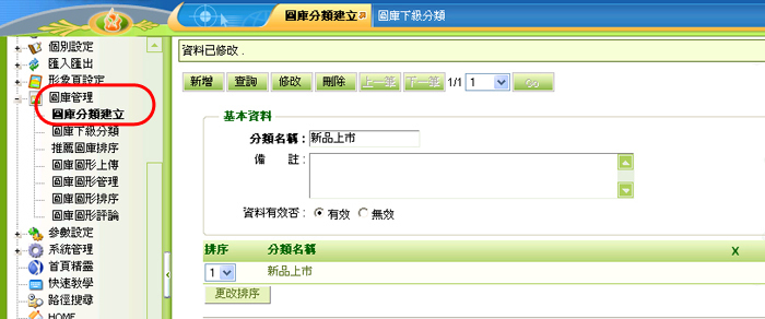 1.首先先至圖庫管理-->圖庫分類建立針對所要呈現的圖庫設定分類基本資料。