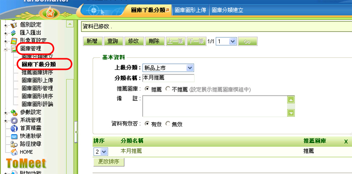 2.再於圖庫管理-->圖庫下級分類建立步驟1所建立的圖庫分類的下級分類名稱,亦可增設為推薦圖庫。