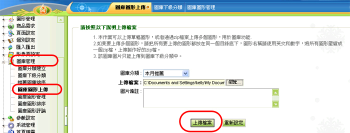 3.再利用圖庫管理-->圖庫圖形上傳選擇步驟 2所新增的下級分類名稱,再將單一圖檔或壓縮檔(zip檔)上傳。