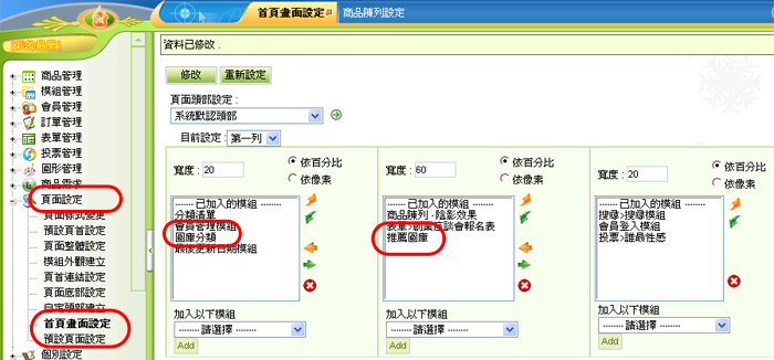 5.將已建置完成的圖庫模組加入至頁面欄位中網站前台即可呈現。可至頁面設定-->首頁畫面設定/預設頁面設定中,將圖庫分類或推薦圖庫模組加入。