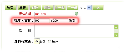 先執行「圖形管理」中的「廣告規格建立」建立一個規格,規格必須與廣告圖片相同,假設圖形的寬度與高度為100x200,則您的廣告規格建立中的寬度與高度就要設定為100x200。