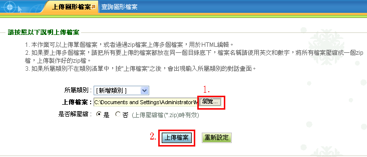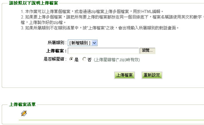 | 1. | 請先到「圖形管理→上傳圖形檔案」以瀏覽的方式將您的音樂檔上傳。 |