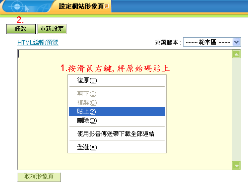 | 9. | 1>到後台「形象頁設定→設定網站形象頁」按滑鼠右鍵「貼上」,將原始碼貼到中間區域。 2>按下「修改」。 |