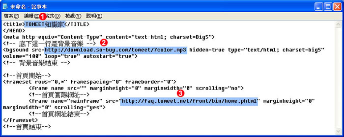 | 8. | 1>將 TOMEET知識家 換成自己的網站名稱。 2>將下列語法中 http://download.so-buy.com/tomeet/7color.mp3 的部份,改為我們上傳影音檔的URL:http://csd-tm.so-buy.com/ezfiles/csd-tm/img/img/28586/01-Intro.mp3。 3>將下列語法中 https://faq.tomeet.net/front/bin/home.phtml 的部份,改為後台「形象頁設定→設定網站形象頁」功能說明裡的首頁連結URL。 |