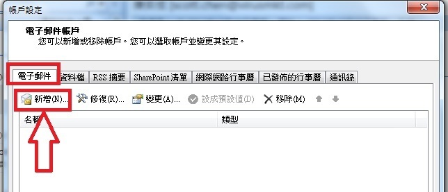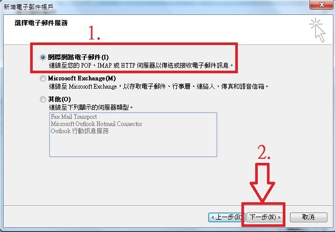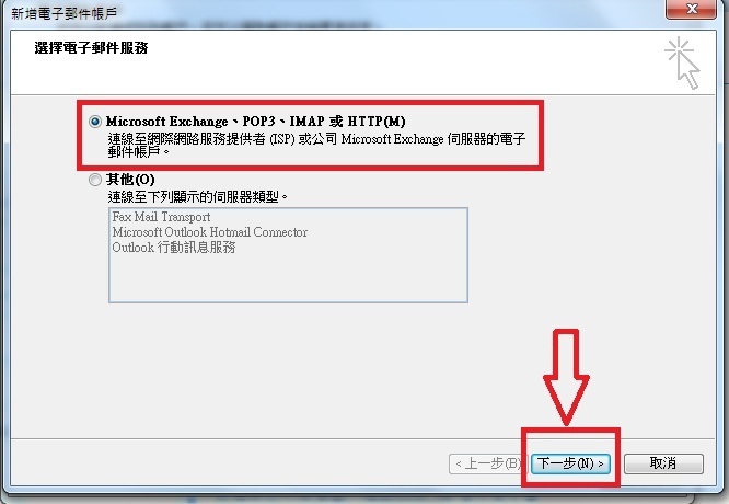 1)點選「Microsoft Ezchange、POP3、IMAP或HTTP (M)」 |