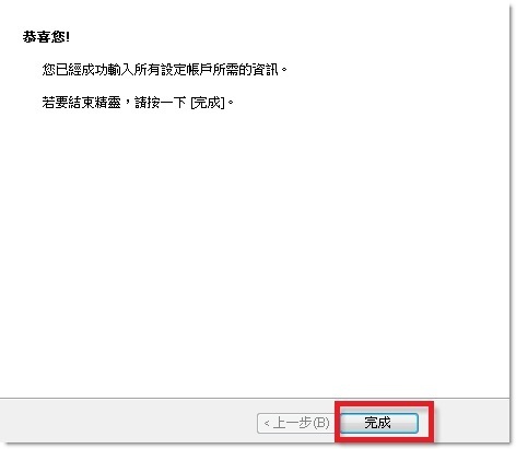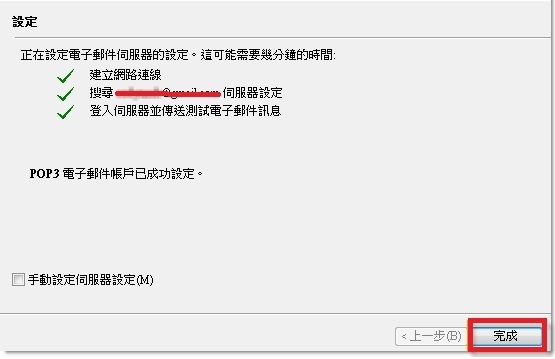 | 15. | 出現設定成功畫面,點選「完成」即可 ※註:若還是無法設定成功,請點選 這裡 至Gmail網站參考是否伺服器參數值有異動,或是此功能已暫停服務 |