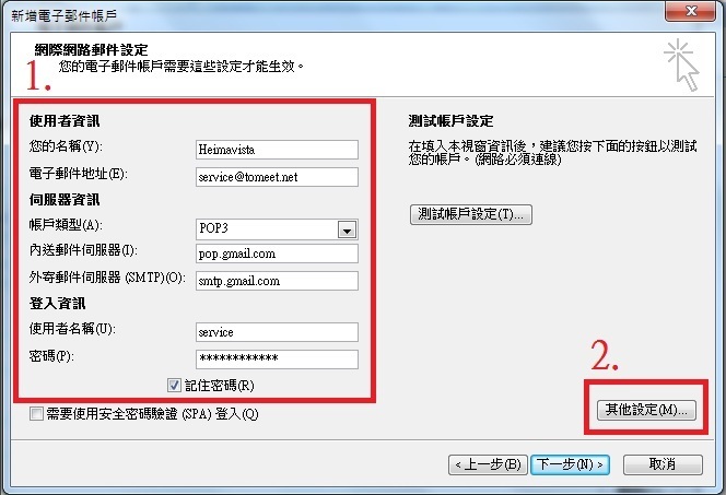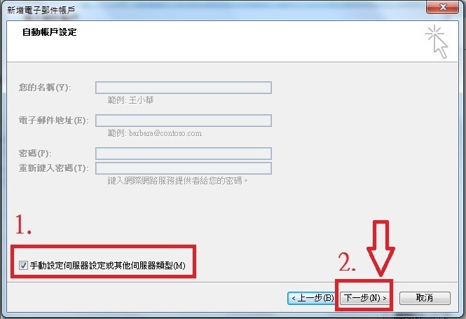 | 9. | 1)請回到上個步驟,點選「手動設定伺服器設定或其他伺服器類型」 2)點選「下一步」 |