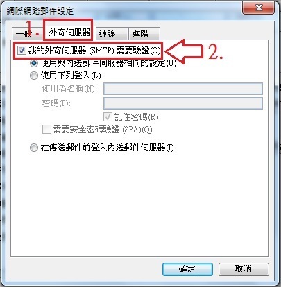 | 12. | 1)點選「外寄伺服器」 2)勾選「我的外寄伺服器(SMTP)需要驗證 (O)」 |
