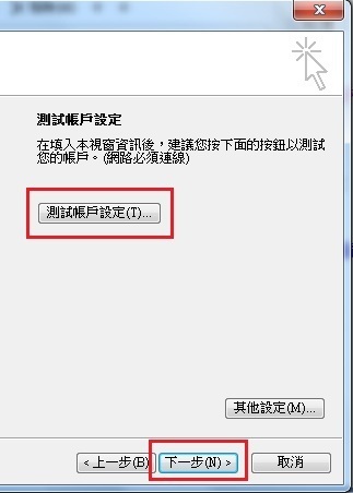 | 14. | 可以點選「測試帳戶設定」來試試看設定是否可以使用,提示訊息出現成功,即可按「下一步」 |