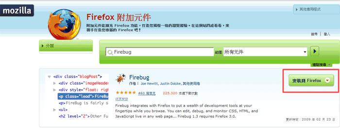 | 3. | 安裝完成後,請開啟Firefox瀏覽器,並進入網址 https://addons.mozilla.org/zh-TW/firefox/addon/1843 ,安裝「Firebug附加元件」。 |