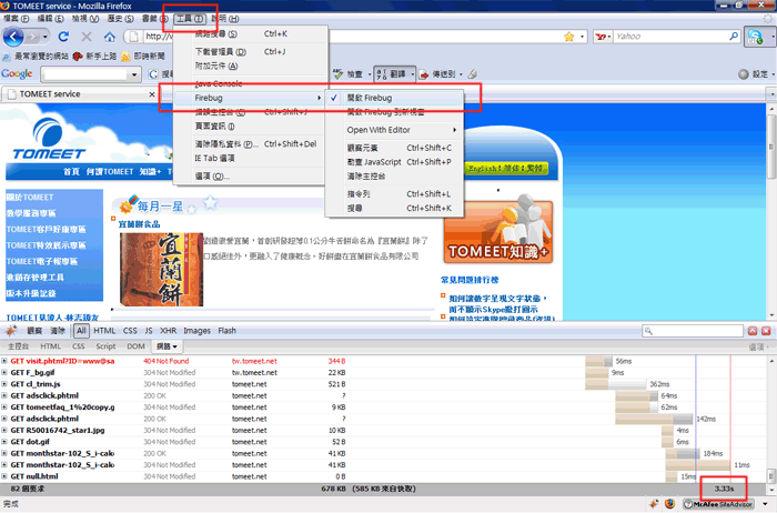 完成後,請您進入您的網站,並點選「工具→Firebug→勾選開啟Firebug」,視窗下方即會詳列頁面內容所佔大小及時間,您可依照檢測結果判斷造成原因,最右下角則為網站開啟總秒數,如秒數檢測結果為10s內,均屬正常值範圍。 |