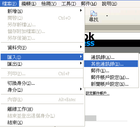 | 4. | 儲存完成後,開啟Outlook Express,選擇「檔案→匯入→其他通訊錄」 |