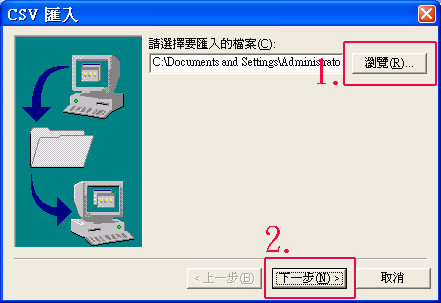 | 6. | 1.瀏覽已存在您電腦上的.csv檔 2.按「下一步」鍵 |