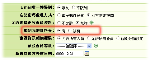 | 1. | 於後台「參數設定」中的「軟體功能設定」,將「加入我的資料夾」選項設定為「有」。 | ||||