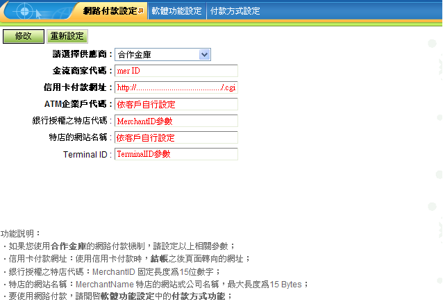 | 4. | 至後台「參數設定/付款方式設定」設定您的網路付款方式 |
