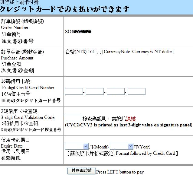 | 附註:前台合作金庫信用卡付款導入畫面 (如使用金流商提供的測試環境,會有測試卡號及其它項目可於此步驟時填入) |