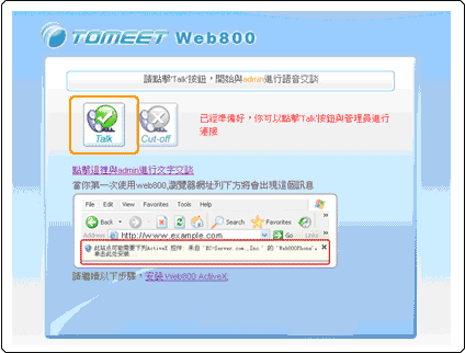 一般的即時通訊服務(Instant Messenger),雙方需要安裝相同軟體,互相留下帳號;在Internet的世界,客人訪問網站想要與您溝通時,如果能夠不需要留下帳號就能夠通訊,這將是讓客人很安心的服務;WEB800 正是這樣的軟體,使用者不需要安裝軟體,不需要留下帳號密碼,就可以與您進行即時的語音通訊和文字交談。
