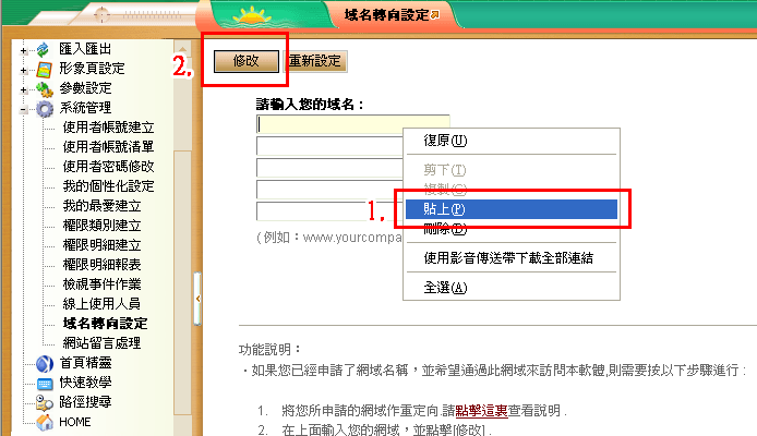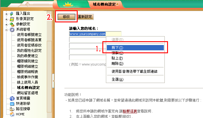 1. 若進入後台管理介面後,請選擇「系統管理」→「域名轉向設定」,發現您的域名已有先自行輸入,請參照以下步驟,重新設定: