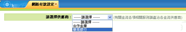 請至網站後台「參數設定/網路付款設定」選擇 「華南銀行」 |