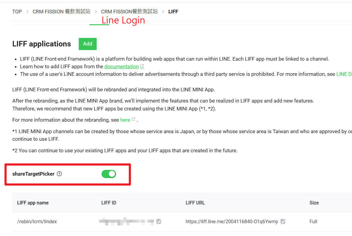 請在line開發者,選擇對應您的環境>>Line login>>Liff>>底下的sharetargetpicker打開