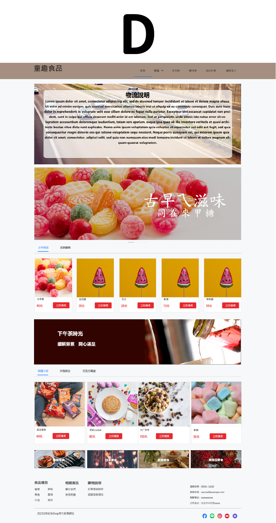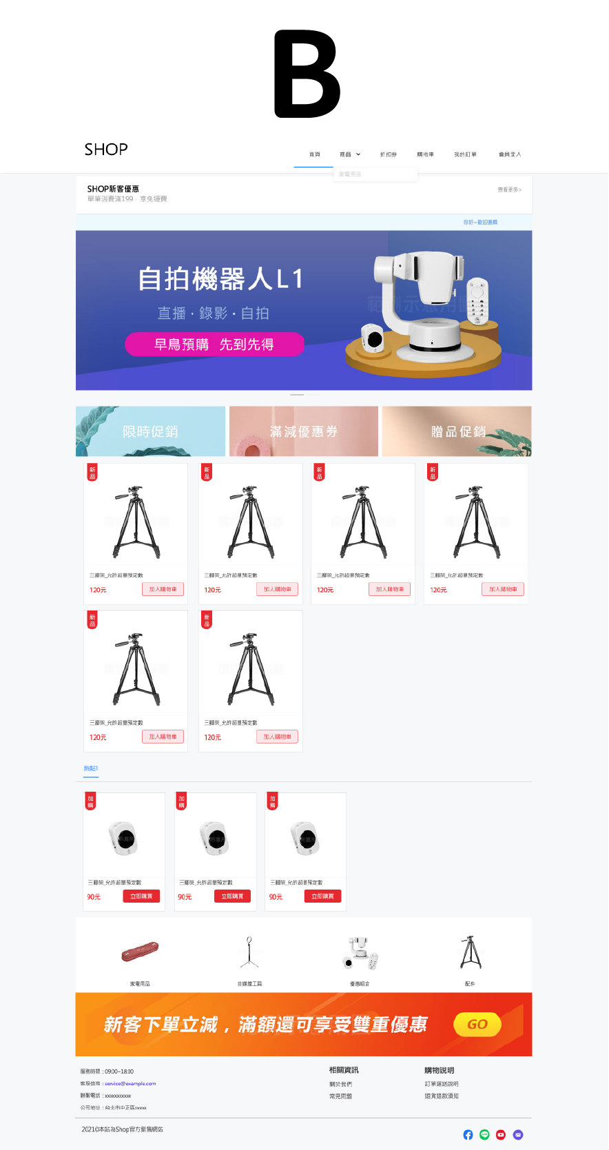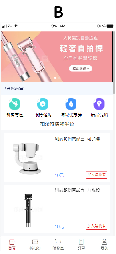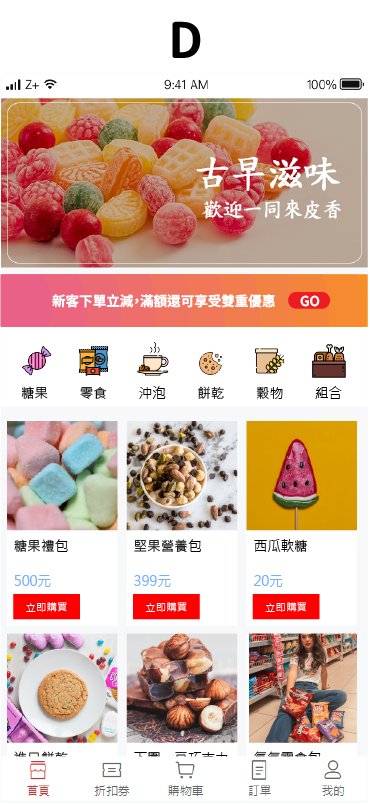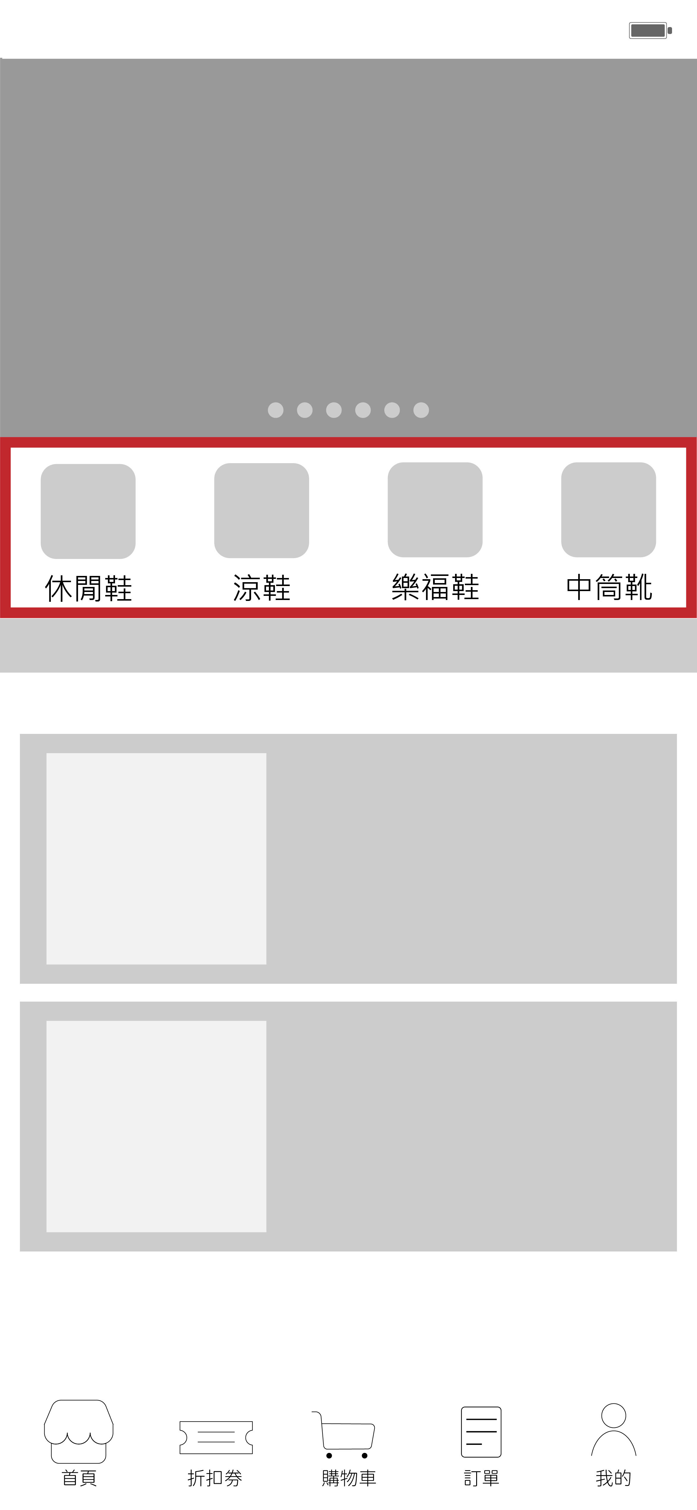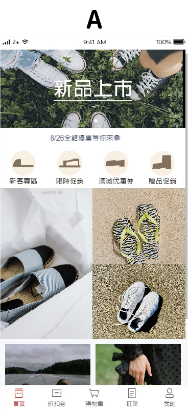文字搭配圖示,點選即可跳往該區訊息處,新客專區/限時促銷/滿減優惠券/贈品促銷 也可是商品類別,例如:休閒鞋/涼鞋/樂福鞋/中筒靴